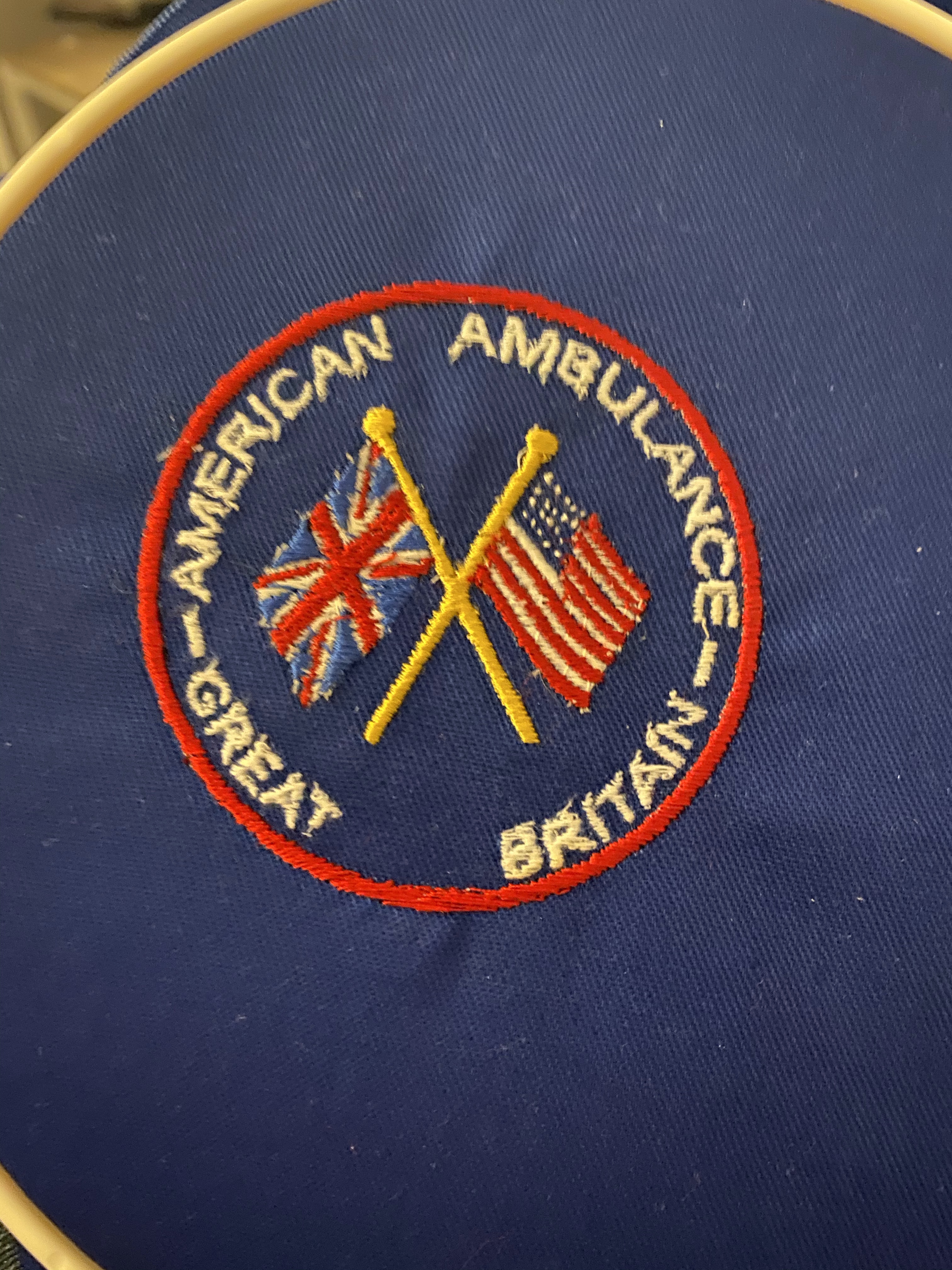 This series of photos shows the process of getting our designs right, these are the service badges, given to members of the American Ambulance each year. The design and size I’m happy with now. These prototype versions are embroidered on white, I’m yet to track down the authentic looking “service dress” fabric but once I do they will be embroidered onto that!