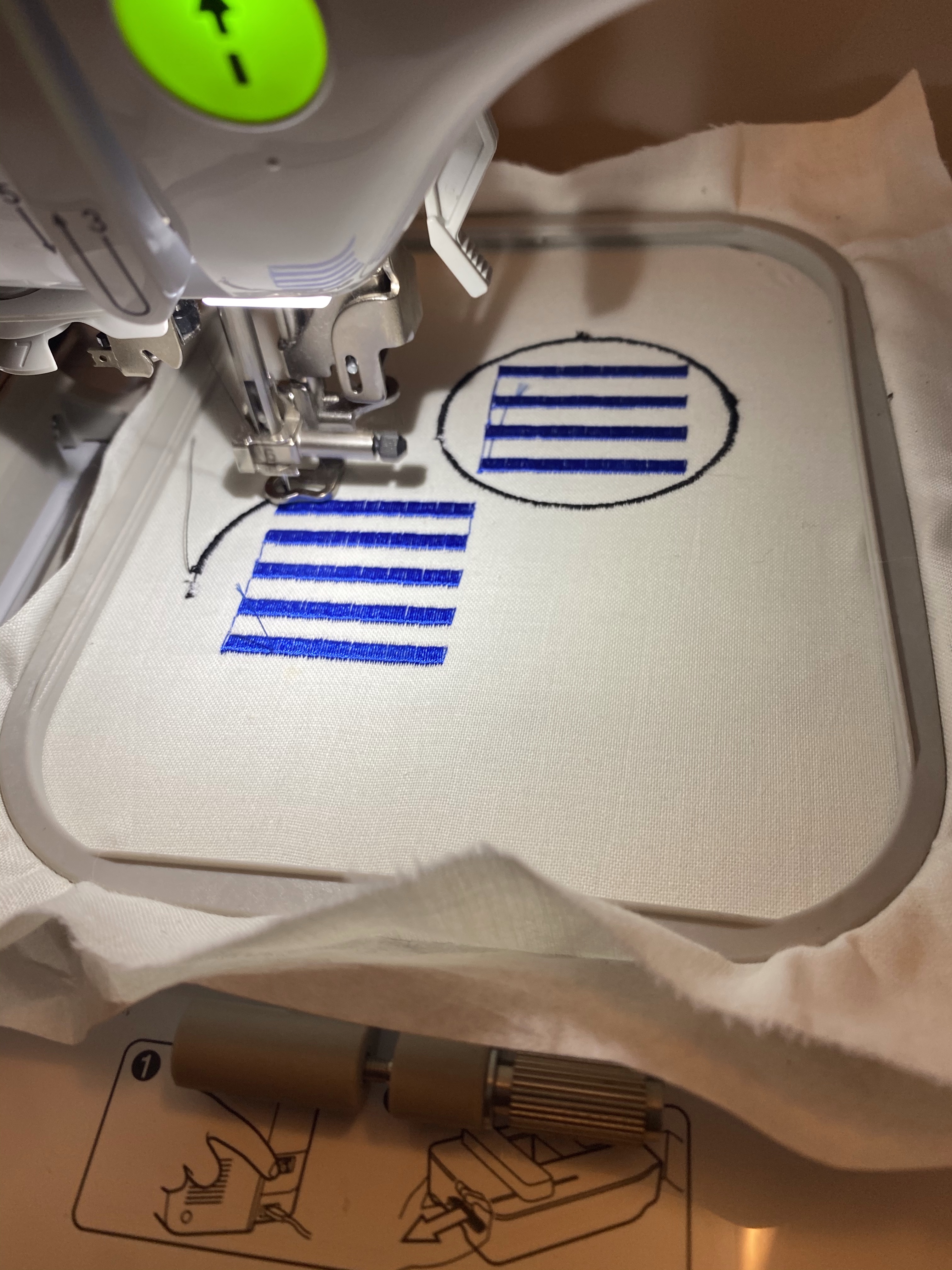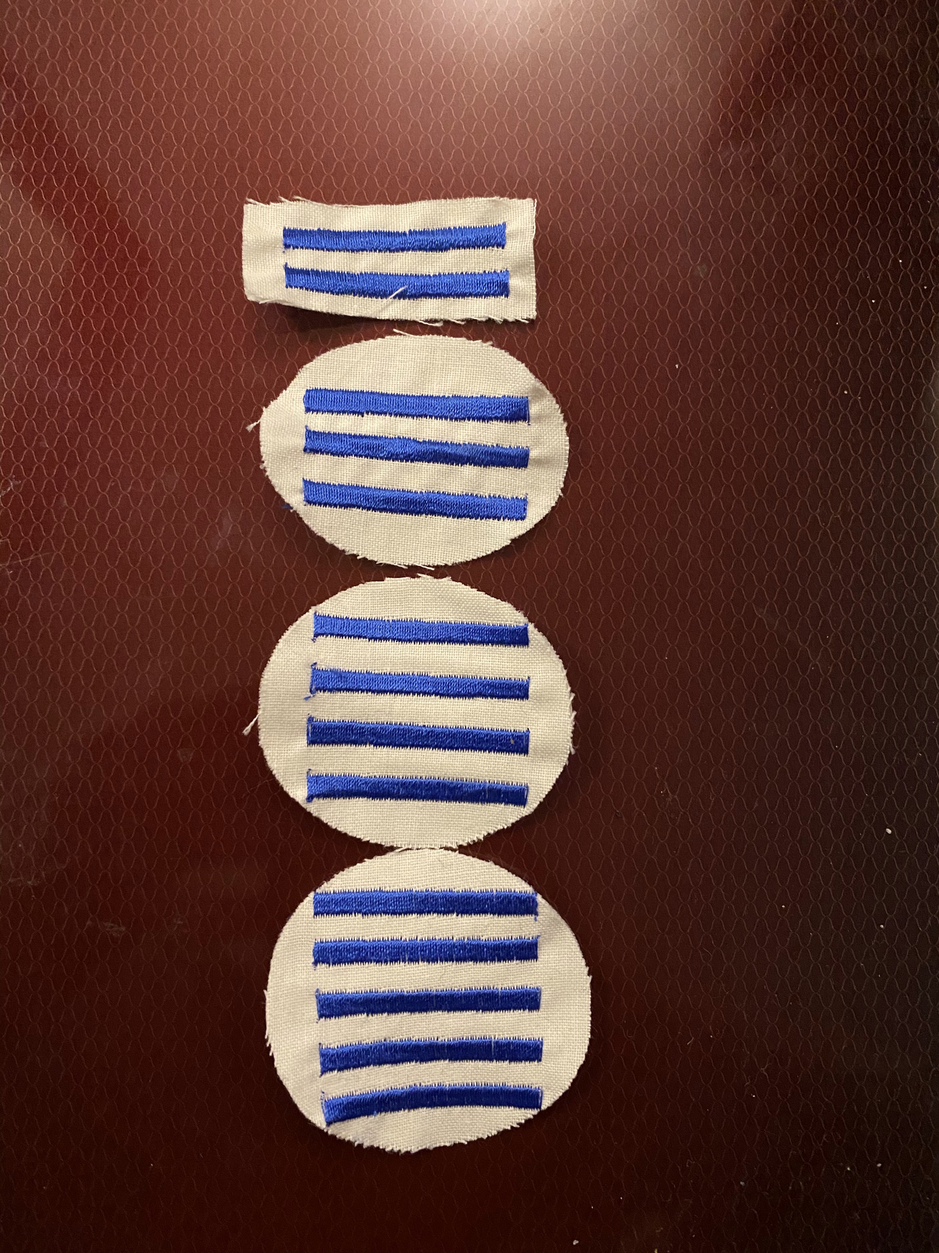 First we’re looking at the distinctive American Ambulance arm badge, the gallery shows the progression of the embroidery. The machine splits up the colours, white, blue, yellow then red. It takes about 25 minutes in total to embroider. Once done, the slightly tedious task of cutting all the excess thread off the badge. After this the stars are hand embroidered, this gives a more authentic look, and the machine struggles to do these small details. After all this the badge is cut out and ready to sew on.