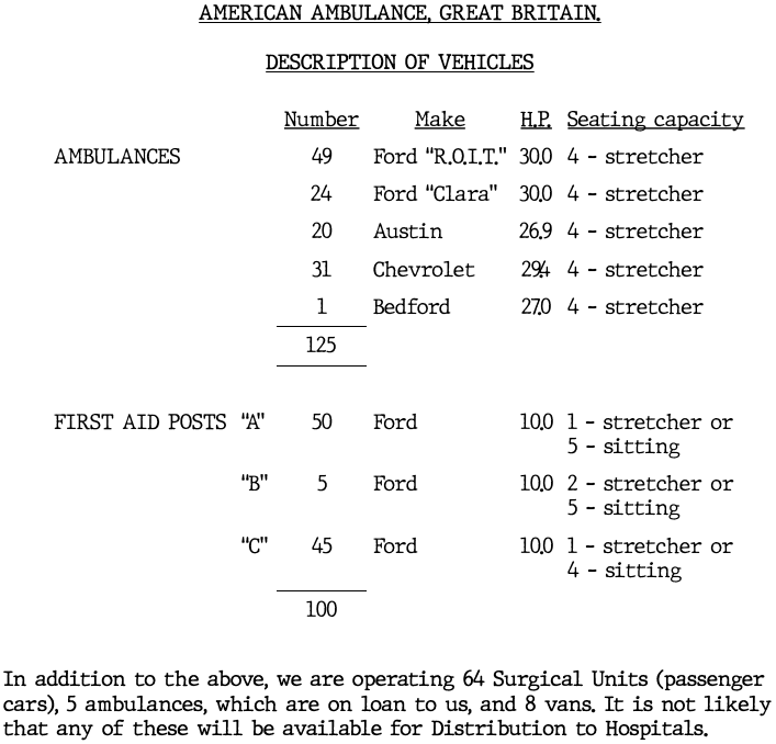 Above is a table from 1945 detailing the vehicles available to disposal to local hospitals after stand down.